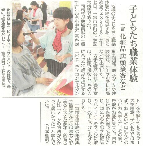 17日に上林記念病院で開催された職業体験イベント『きらめきフェス』が、18日(月)付の中日新聞・尾張版および20日(水)放送のICCチャンネル「でいりぃ★トピックス」で紹介されました。 中日新聞(尾張版)・6月18日(月)付・朝刊【記事見出し】子どもたち職業体験 I…